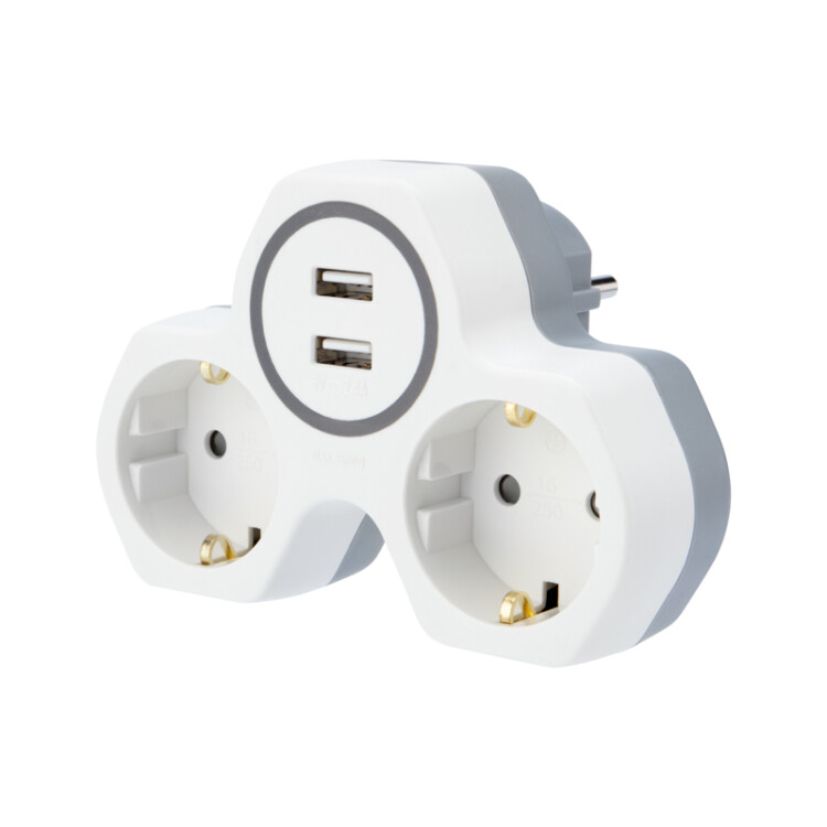 Разветвитель, 2 гнезда, 16A, с/з, IP20, пластик, белый, с защитными шторк., 2USB 2А