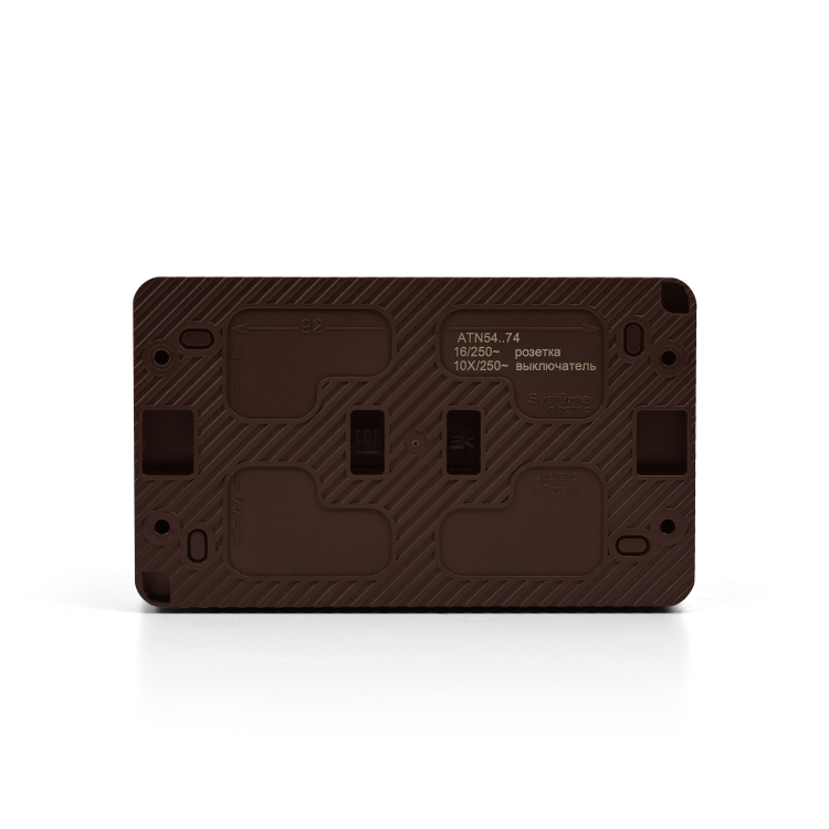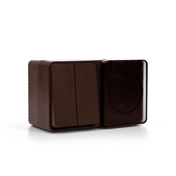 Блок выключатель 2 клавишный + розетка 2Р+Е со шторками накладной коричневый AtlasDesign Profi54