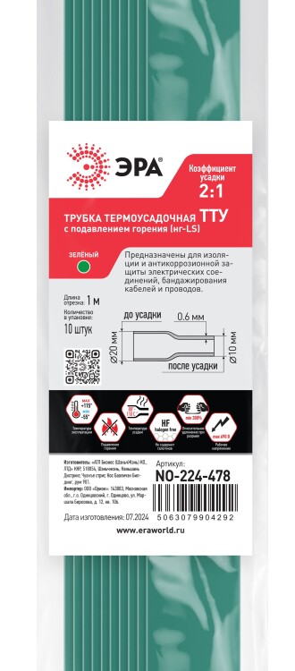 Термоусадочная трубка ЭРА NO-224-478 ТТУ нг-LS 20/10 зелёная в отрезках по 1 м. (упаковка 10 штук)