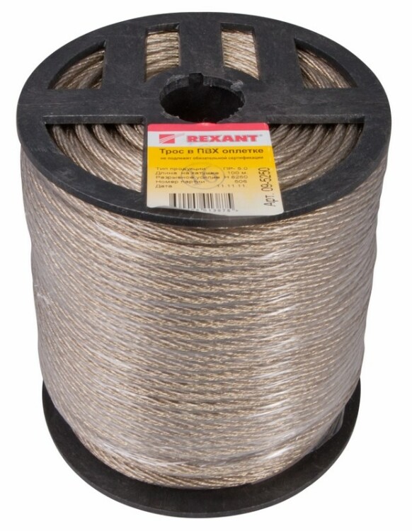 Трос стальной в ПВХ оплетке d=5,0мм, прозрачный (буxта 100м) REXANT
