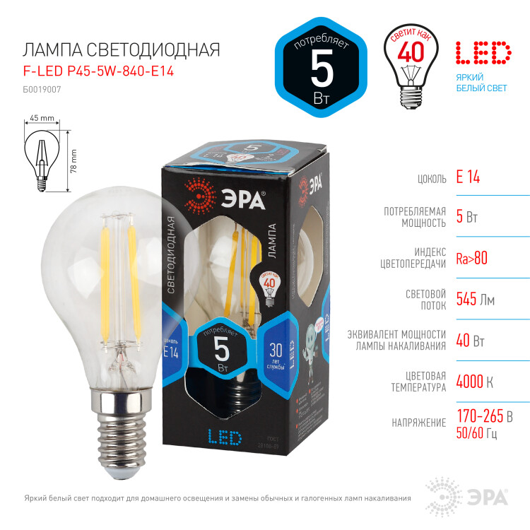 Лампочка светодиодная ЭРА F-LED P45-5W-840-E14 Е14 / Е14 5Вт филамент шар нейтральный белый свет