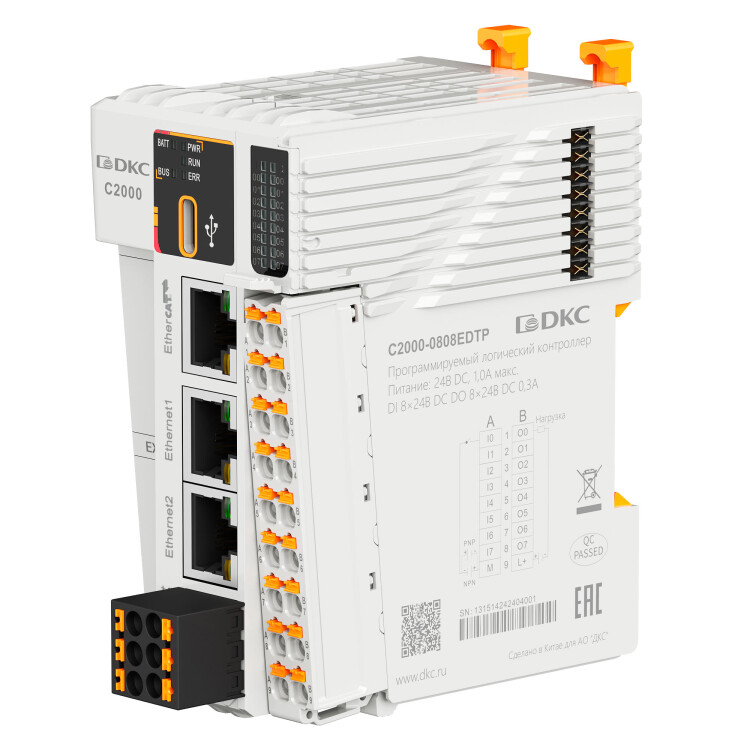 Процессорный модуль программируемого логического контроллера C2000, н.пит. –24В DC, 8 DI - 24В DC, 8 DO - 24В DC(PNP), ком. порты – 1хRS485, 2хEthernet, 1хEtherCAT, 1хType-C, 2 модуля расш-ния моноблока (BD)
