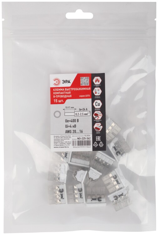 Клемма ЭРА NO-225-362 быстрозажимная 2273-208 компактная 8-проводная 0.2-2.5 мм2 упаковка 15 шт