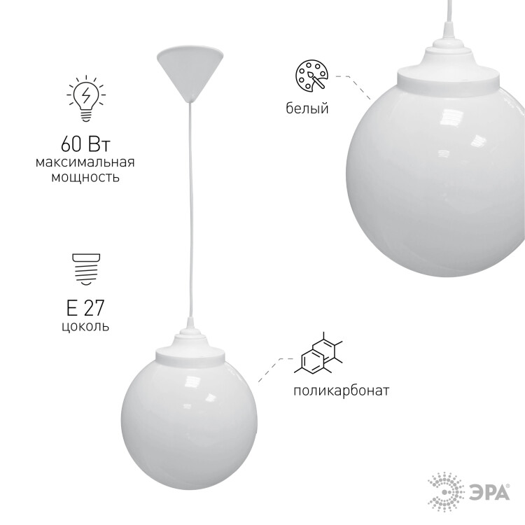 Cветильник потолочный ЭРА НСБ 01-60-251 шар опаловый подвесной на шнуре IP44 Е27 max 60 Вт d250mm