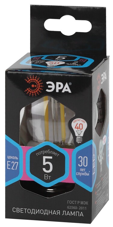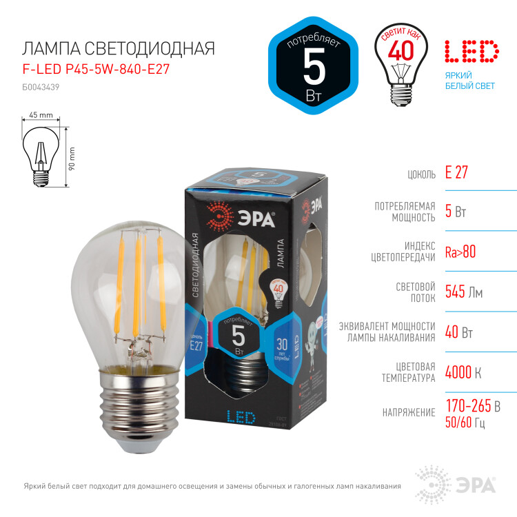 Лампочка светодиодная ЭРА F-LED P45-5W-840-E27 Е27 / Е27 5 Вт филамент шар нейтральный белый свет