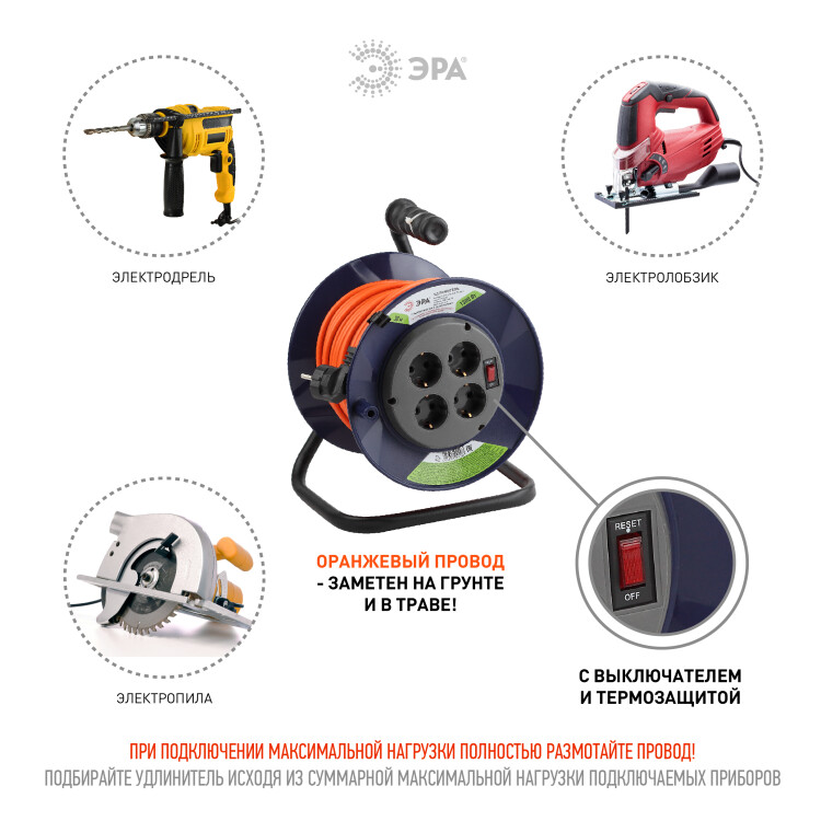 Удлинитель силовой ЭРА RPx-4es-3х0.75-30m на пластиковой катушке c заземлением 4 розетки 30м ПВС 3х0.75мм2