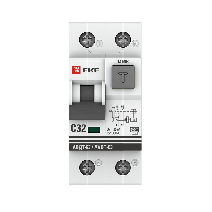 Автомат. выкл. дифф. тока 2-пол. 32А 30мА тип AC 6кА хар-ка C серия АВДТ-63 EKF