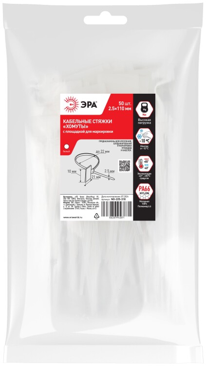 Кабельная стяжка ЭРА NO-225-318 (хомут) нейлоновая 2.5 х 110 мм белая с площадкой для маркировки 21 х 10 мм (50 шт/уп)