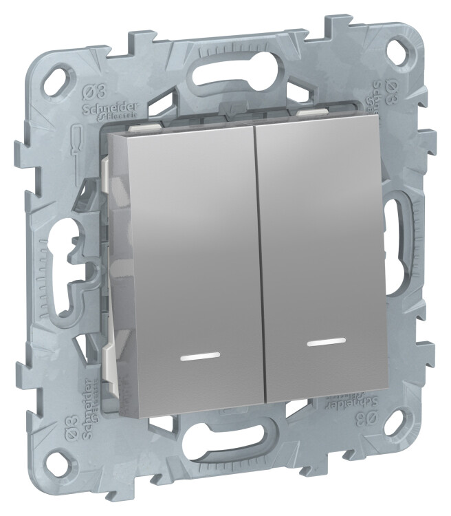 Выключатель 2 клавишный с подсветкой 10А алюминий Unica New