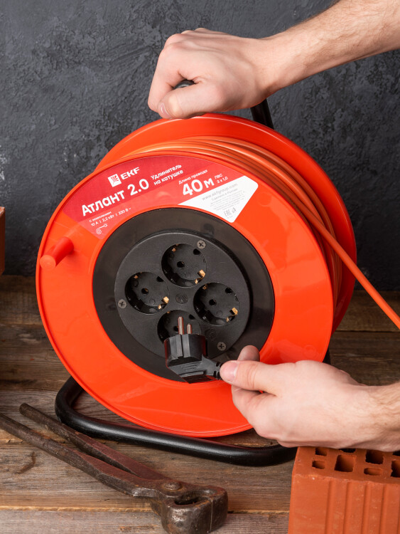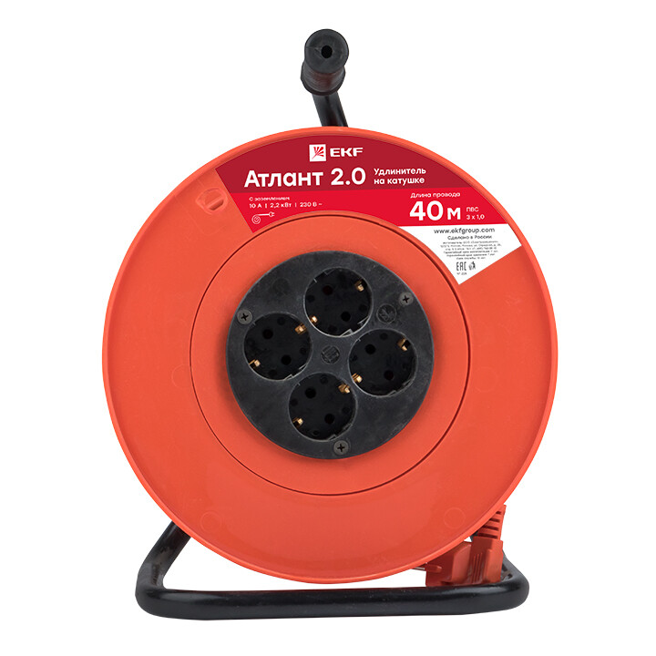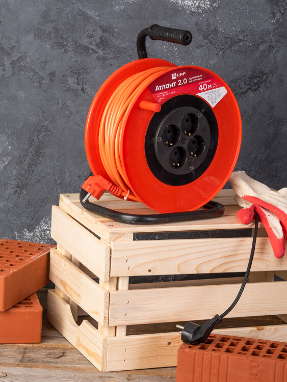 Удлинитель на катушке "Атлант 2.0" 4 гнезда 40м с заземлением ПВС 3*1,0 10А/2,2кВт PROxima