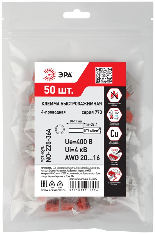 Клемма ЭРА NO-225-364 быстрозажимная 773-604 прозрачная 4-проводная 0.75-4.0 мм2 (упаковка 50 шт.)