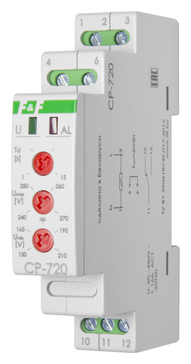 Реле напряжения CP-720 16А 1NO/NC 150-450В AC, IP20 контроль верхнего и нижнего значений напряжения