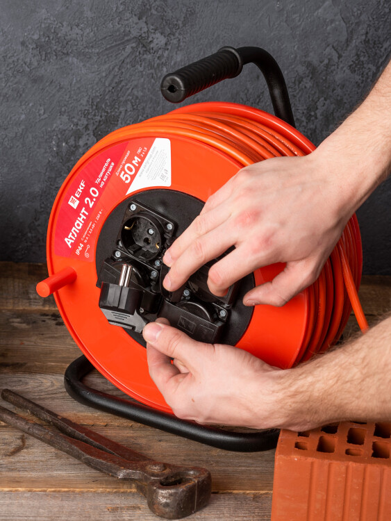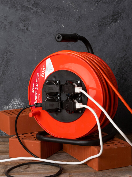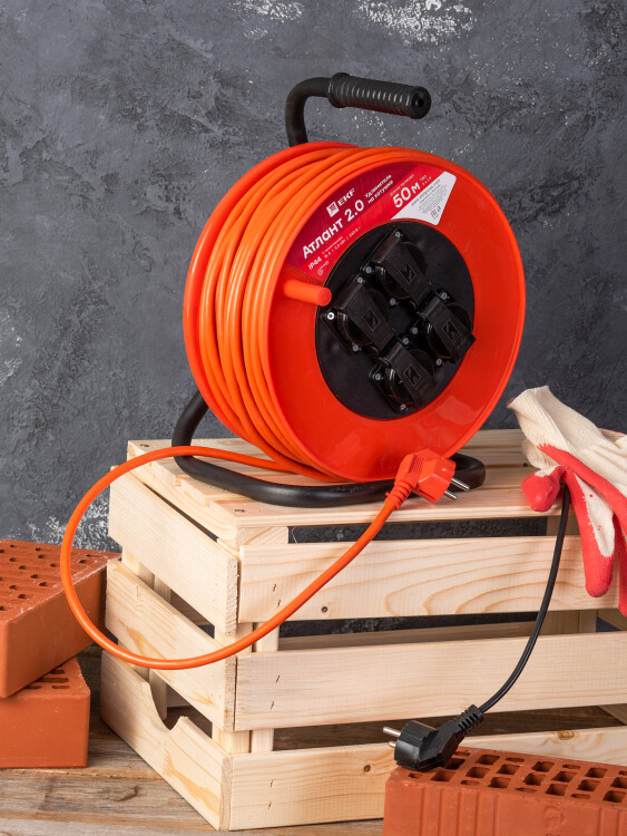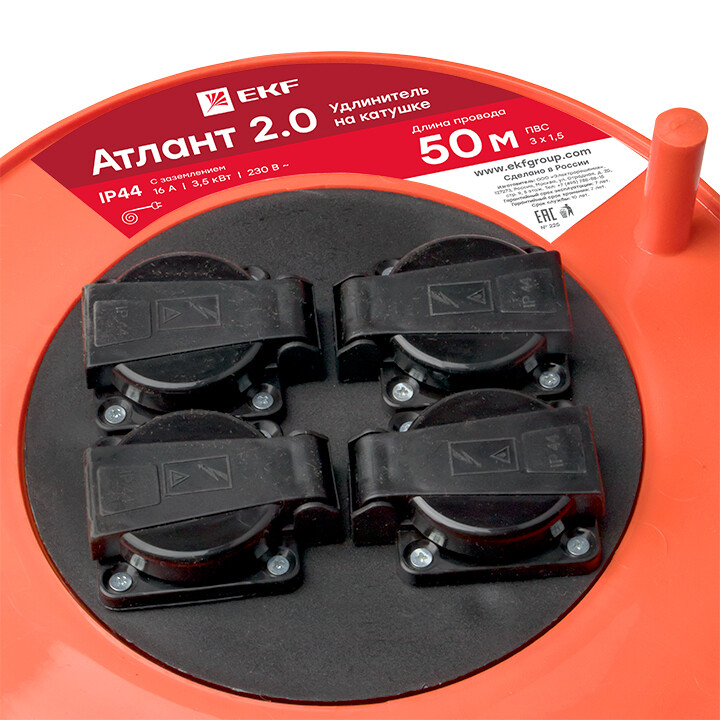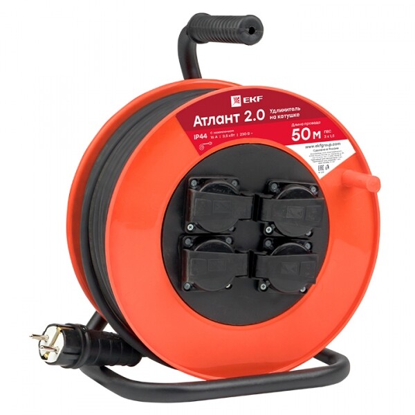Удлинитель на катушке "Атлант 2.0" 4 гнезда 50м с заземлением ПВС 3*1,5 16А/3,5кВт IP44 PROxima EKF