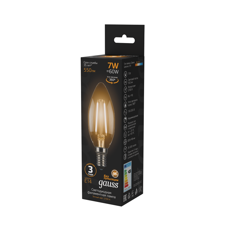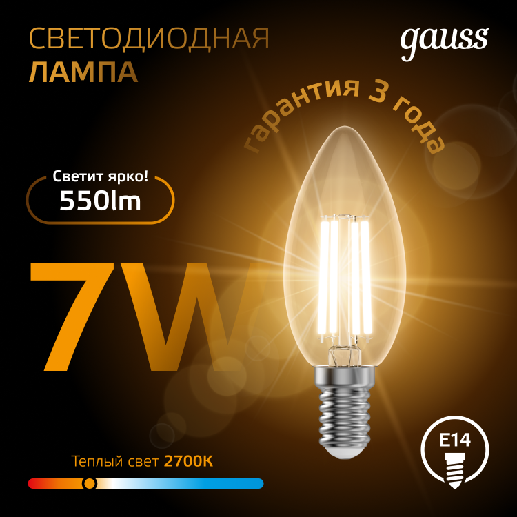 Лампа светодиодная 7 Вт 230В Е14 Filament свеча, тёплый 2700К