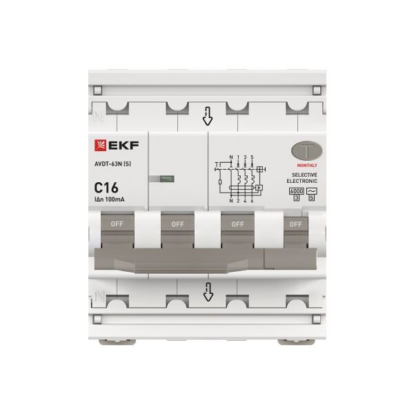 Автоматический выключатель дифференциального тока селективный АВДТ-63N (S) 3P+N 16А 100мА характеристика C тип AC электронный 6кА PROXIMA EKF