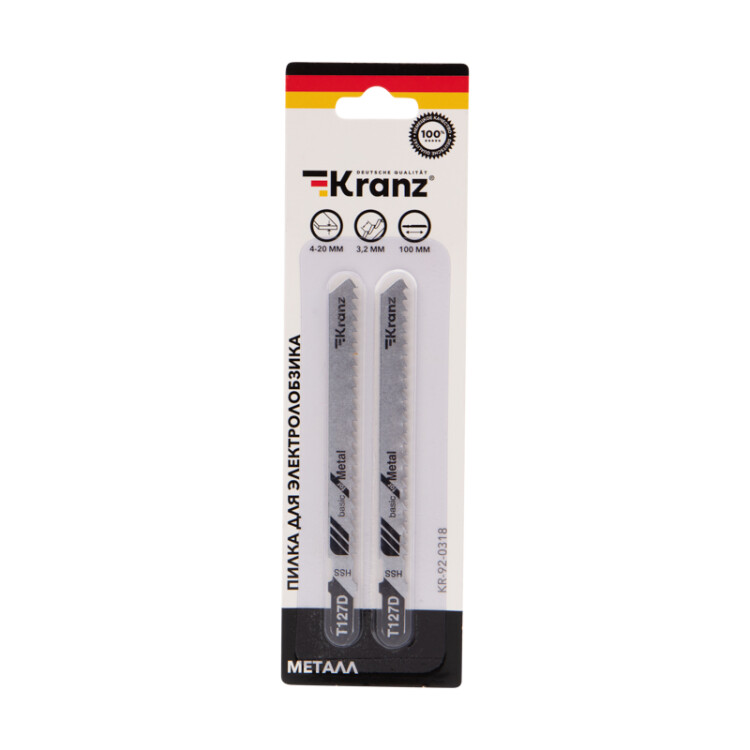 Пилка для электролобзика по мягкому металлу T127D 100 мм 8 зубьев на дюйм 4-20 мм (2 шт./уп.) Kranz