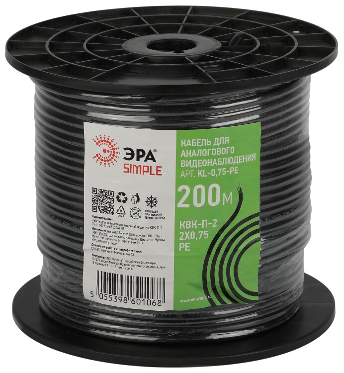 Кабель для аналогового видеонаблюдения ЭРА SIMPLE КВК-П-2+2x0,75 мм2 бухта 200 метров, чёрный