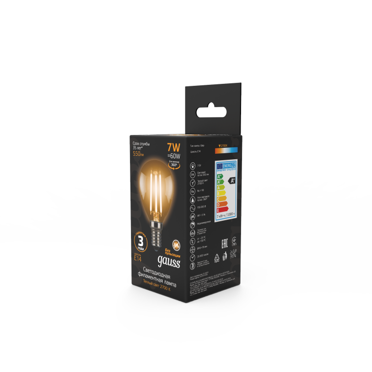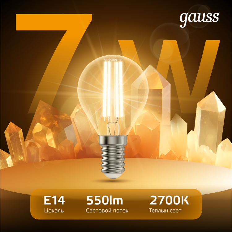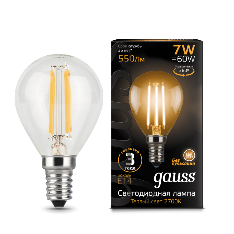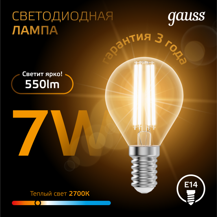 Лампа светодиодная 7 Вт 230В Е14 Filament шарик, тёплый 2700К