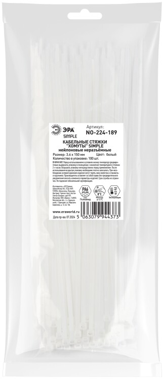 Кабельная стяжка ЭРА NO-224-189 (хомут) нейлоновая 3.6 х 150 мм белая (100 шт/уп) Simple