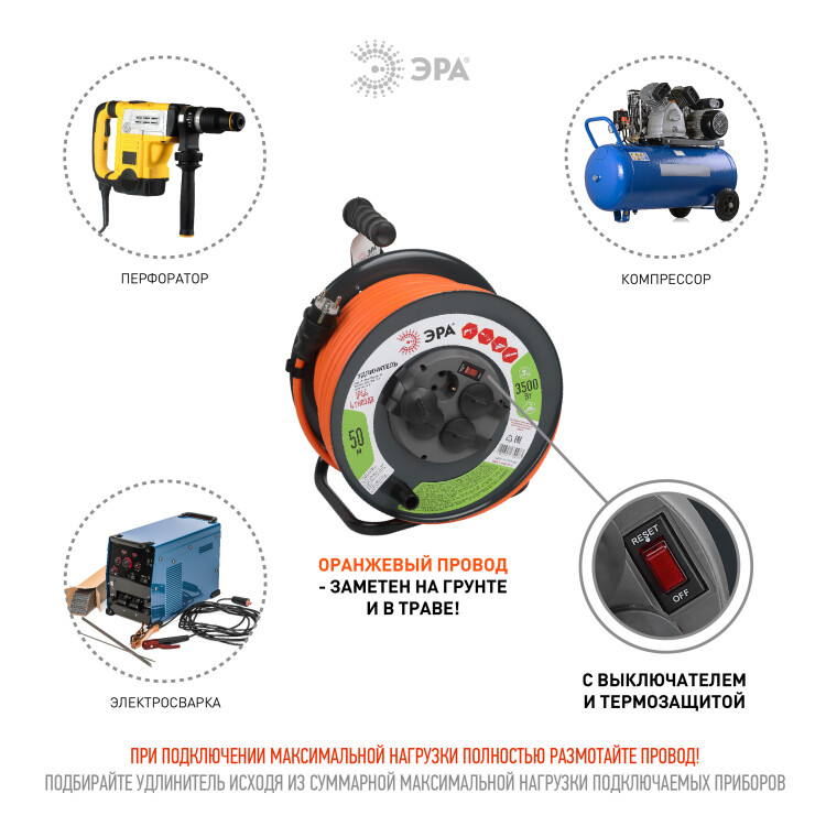Удлинитель силовой ЭРА RMx-4es-3x2.5-50m-IP44 на металлической катушке с заземлением с выключателем 4 розетки 50м ПВС
