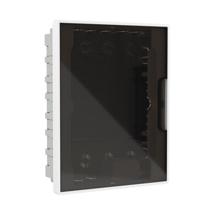 Щиток 24 мод встраиваемый для полых стен слаботочный FRAME, белый, с тонированной дверцей, с монтажной платой,в комплекте с 1 розеткой Viva (арт. 45005) и 1 коробкой PDD (арт. 10033)