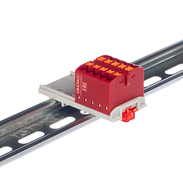 Блок распределительный с верт. адаптером на рейки шириной 15/35мм, зажим push-in, 10 точек подключения 2,5 кв.мм, красный