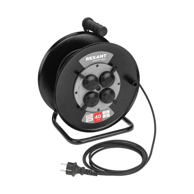 Удлинитель силовой КГ на катушке 4 гнезда, с/з, 40м, 3x1,5мм², IP44 c защитными крышками, металлическая катушка REXANT