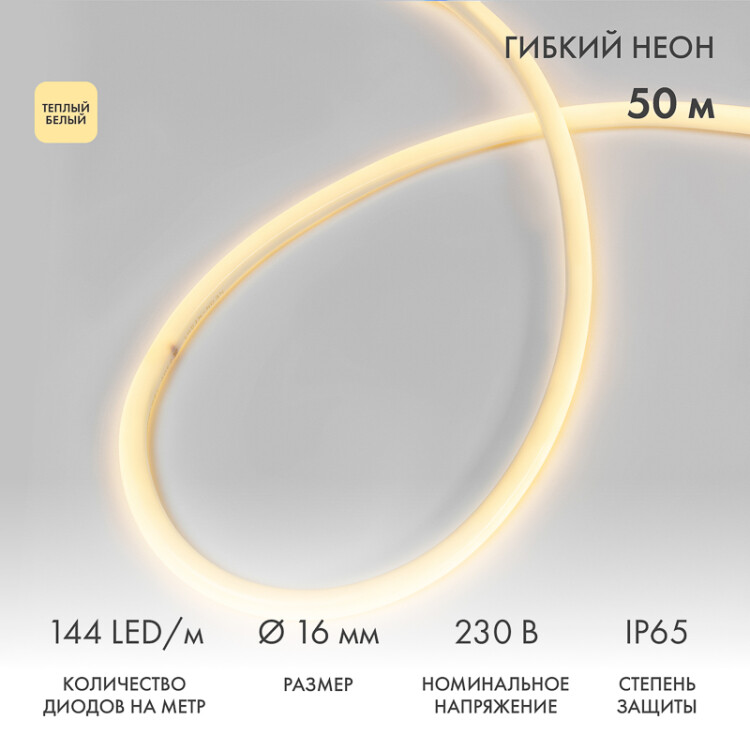 Гибкий неон диаметр 16мм круглый 144 LED/м ТЕПЛЫЙ БЕЛЫЙ 230В буxта 50м (с комплектом подключения) NEON-NIGHT