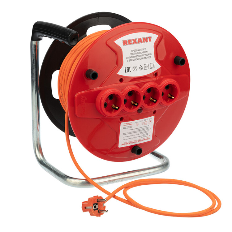 Удлинитель-шнур на катушке REXANT ПВС 3x1.0, 50 м, 4 гнезда, с/з, 10 А, 2200 Вт, IP20, оранжевый (Сделано в России)
