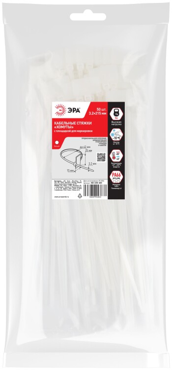 Кабельные стяжки ЭРА NO-225-320 (хомут) нейлоновая 2.5 х 200 мм белая с площадкой для маркировки 25 х 15 мм (50 штук)
