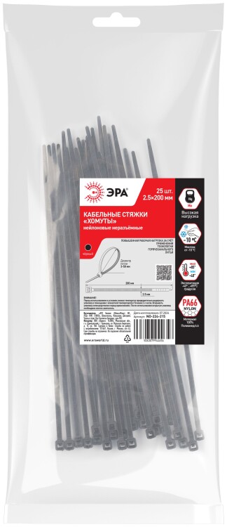 Кабельная стяжка ЭРА NO-224-215 (хомут) нейлоновая 2.5 х 200 мм чёрная (25 шт/уп)