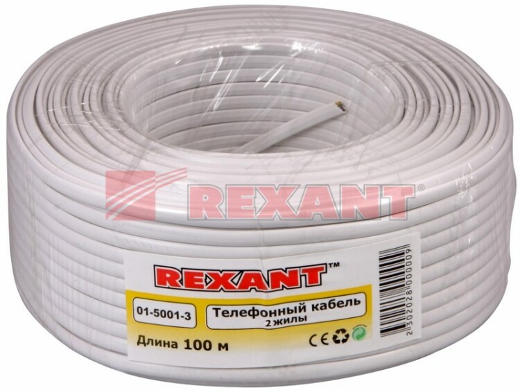 Кабель телефонный ШТЛП 2 жилы CCA, белый, 100м REXANT