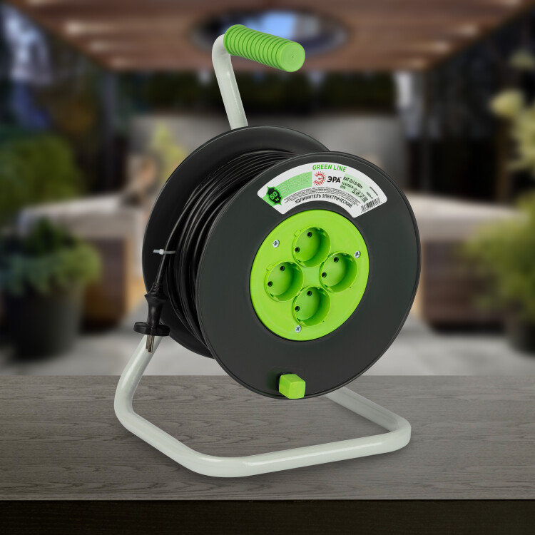 Удлинитель силовой ЭРА GREEN LINE KAT-2x1.5-50m Greenline на катушке пластик 4 розетки без заземления 50м ПВС 2x1.5мм2