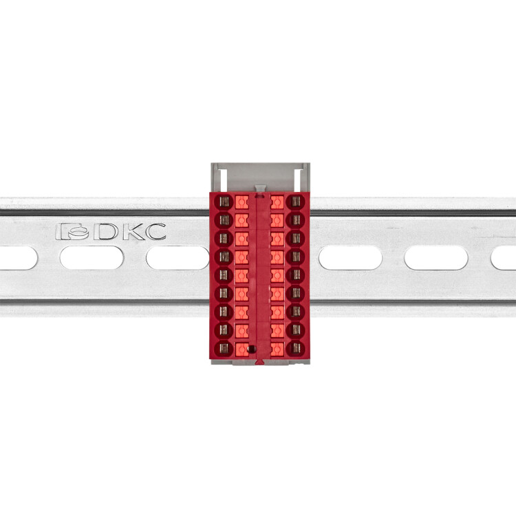 Блок распределительный с верт. адаптером на рейки шириной 15/35мм, зажим push-in, 18 точек подключения 2,5 кв.мм, красный