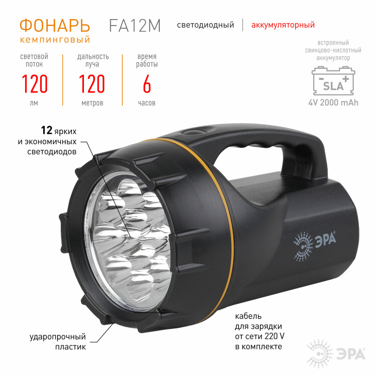 Фонарь прожектор 12LED аккумулятор 4V2AH, ЗУ 220V FA12M