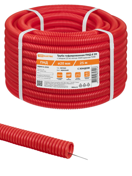 Труба гофрированная ПНД безгалогенная (HF) d 20 с зондом (25 м) легкая 350Н красная ТDM