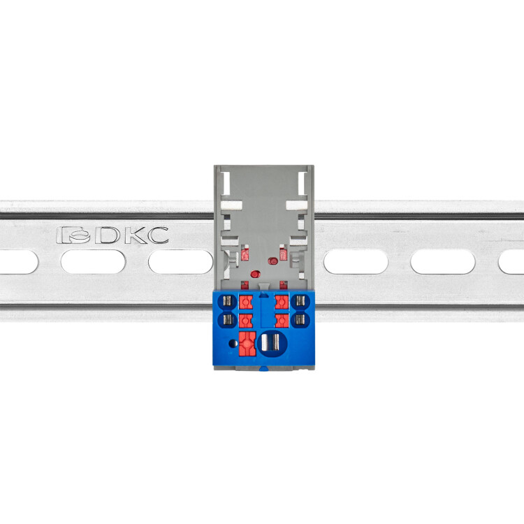 Блок распределительный с верт. адаптером на рейки шириной 15/35мм, зажим push-in, 1 ввод 6 кв.мм, 4 точки подключения 2,5 кв.мм, синий