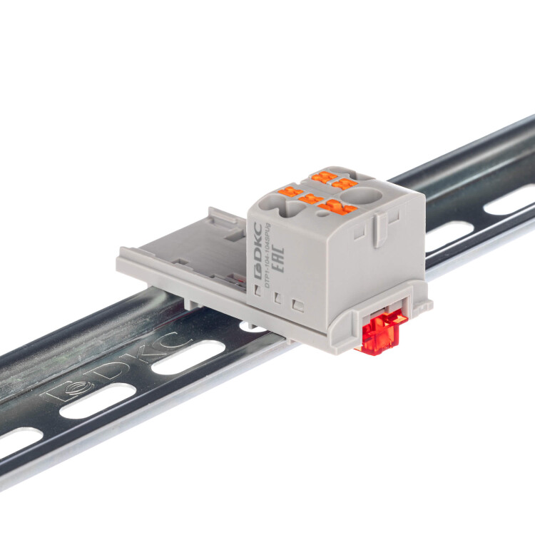Блок распределительный с верт. адаптером на рейки шириной 15/35мм, зажим push-in, 1 ввод 6 кв.мм, 4 точки подключения 2,5 кв.мм, серый