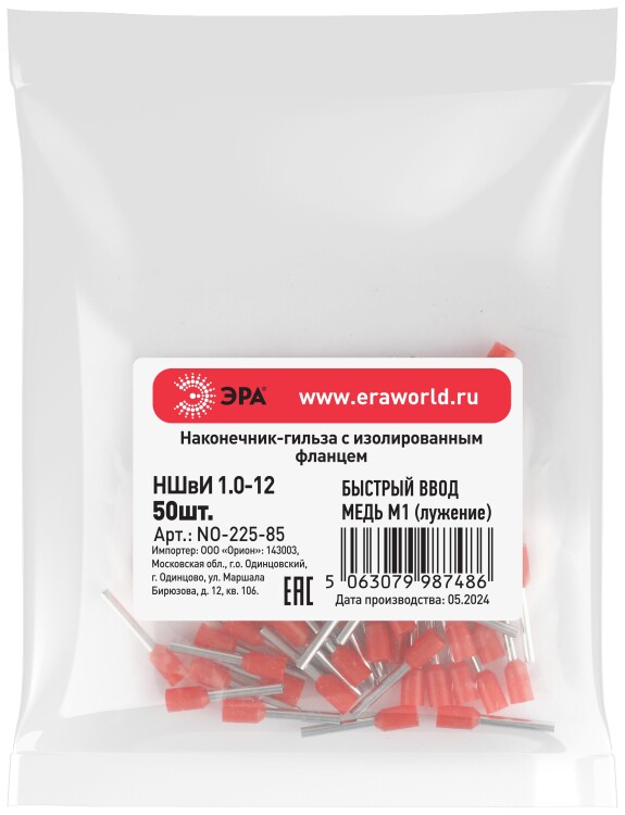 Наконечник-гильза ЭРА NO-225-85 НШвИ 1,0-12 с изолированным фланцем (упаковка 50 шт.)
