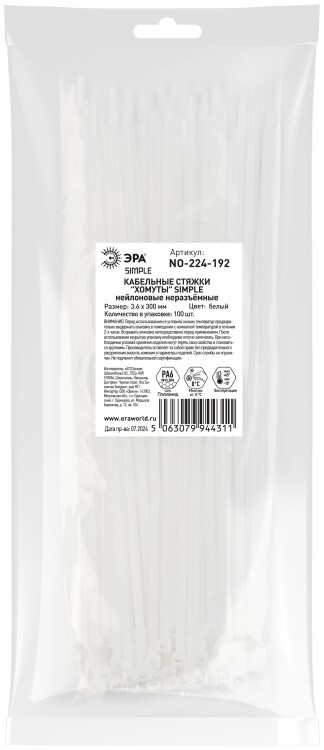 Кабельная стяжка ЭРА NO-224-192 (хомут) нейлоновая 3.6 х 300 мм белая (100 шт/уп) Simple