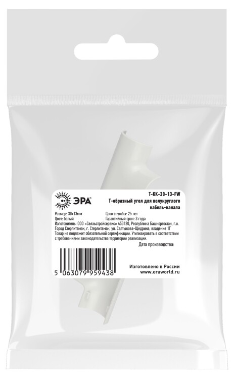 Т-образный угол ЭРА T-KK-30-13-FW для полукруглого кабель-канала белый 30х13мм 2шт/комплект