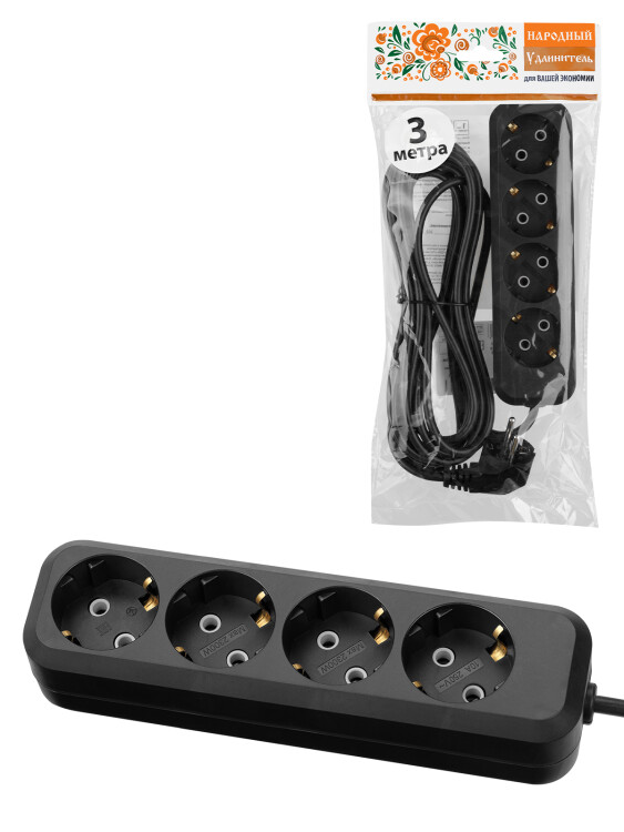 Удлинитель4гнезда,3метра,с/з, 10 А, 2300 Вт, черный, НАРОДНЫЙ