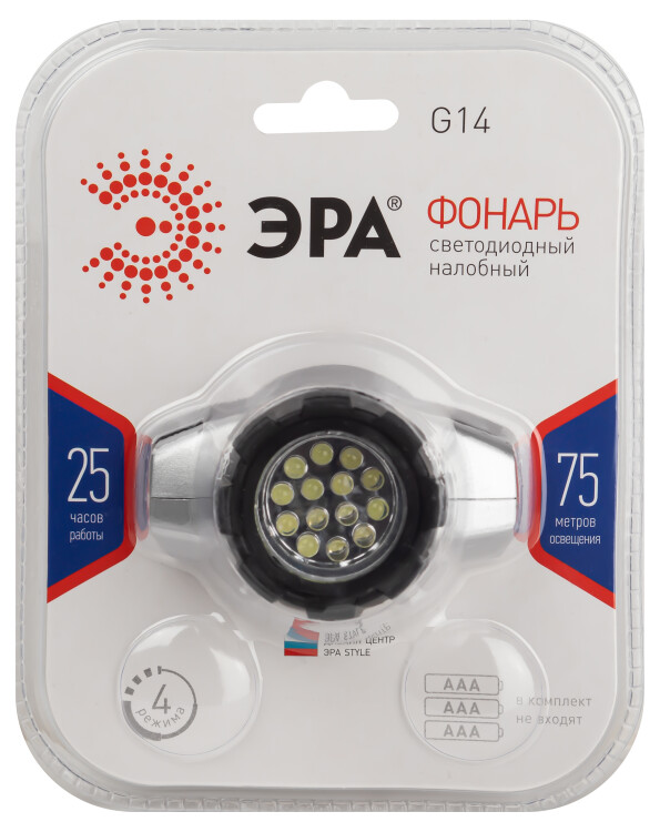 Фонарь налобный светодиодный ЭРА Налобные G14 на батарейках мощный яркий 3 режима серебристый