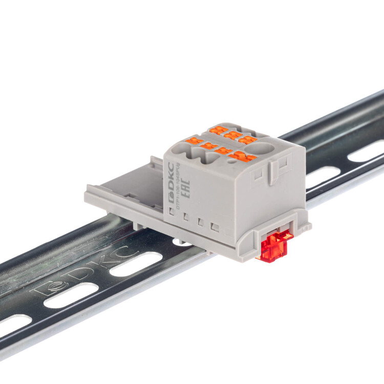 Блок распределительный с верт. адаптером на рейки шириной 15/35мм, зажим push-in, 1 ввод 6 кв.мм, 6 точек подключения 2,5 кв.мм, серый
