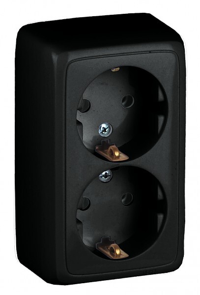 РА16-153-08 Розетка открытой установки, двухместная, с заземляющим контактом, с изолирующей пластиной, цвет черный