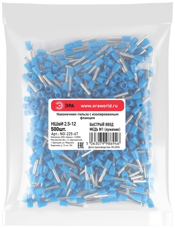 Наконечник-гильза ЭРА NO-225-67 НШвИ 2,5-12 с изолированным фланцем (упаковка 500 шт.)