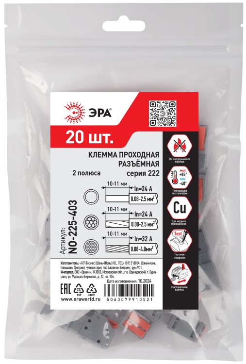 Клемма ЭРА NO-225-403 проходная разъёмная 222-2412R с рычагами 2 полюса 0.08-2.5/4 мм2 (упаковка 20 шт.)