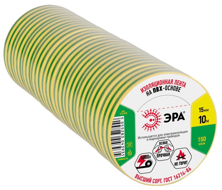 Изолента ПВХ желто-зеленая 15 мм х 10 м (модель 43942/43935)