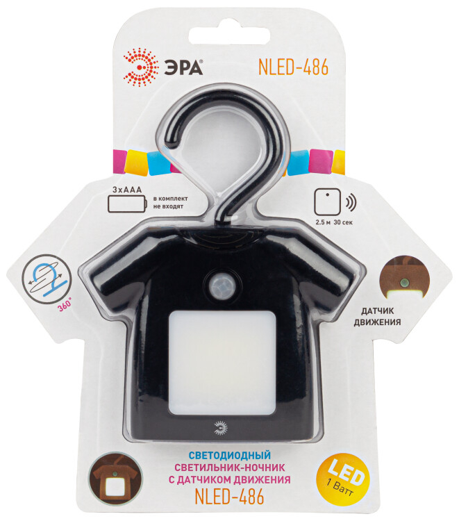 Ночник - светильник светодиодный ЭРА NLED-486-1W-MS-BK на батарейках с датчиком движения черный