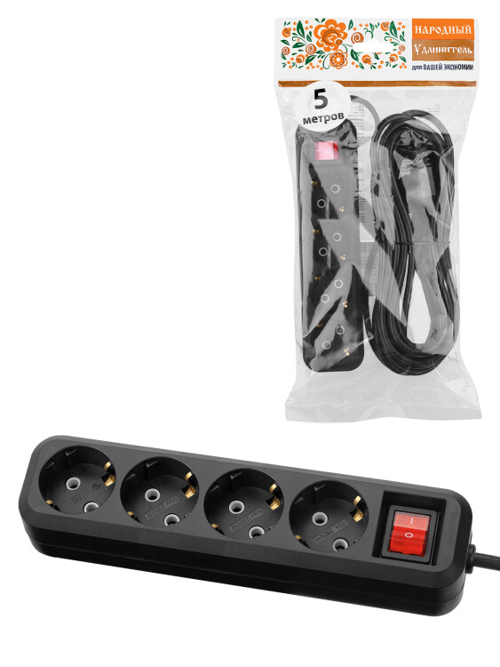 Удлинитель4гнезда,5метров,с/з, выкл., 10 А, 2300 Вт, черный, НАРОДНЫЙ